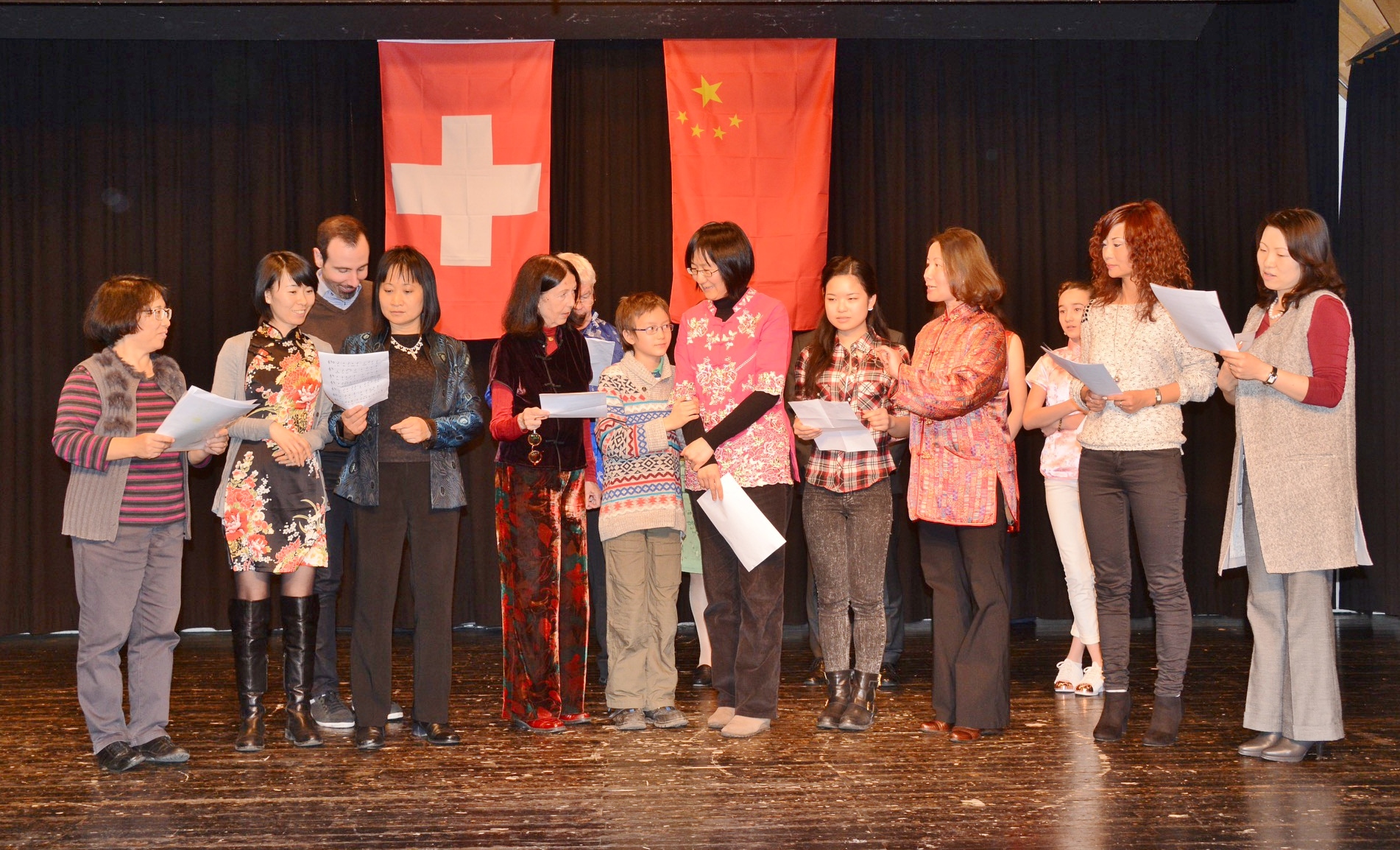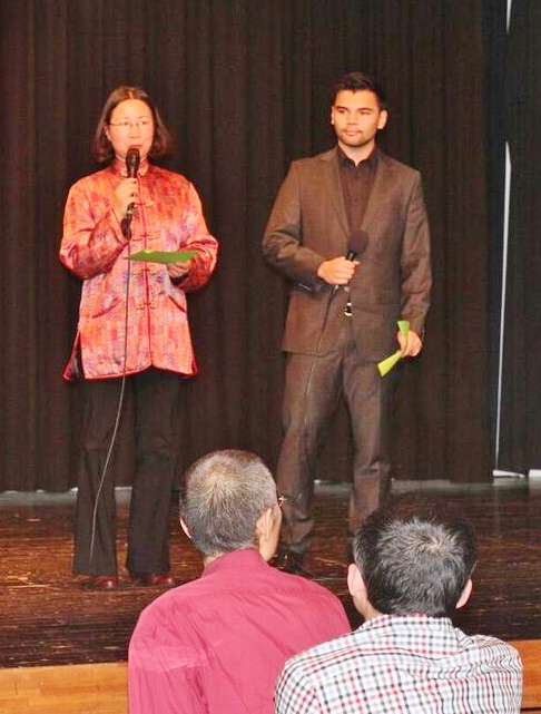 Wenmin Jowanka-Zhang und Matthias Santschi erzählen, was auf dem Programm steht. Schweizerische Chinesich Lernende haben die Vorführung während dem ganzen Jahr für dieses Fest einstudiert.